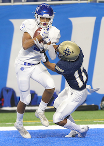 PHOTOS: (Top) Grand Rapids Catholic Central’s Joey Silveri breaks away against Detroit Country Day on Saturday. (Middle) Jace Williams pulls in one of his three touchdown catches during the Division 4 Final while Country Day’s Luke Ammori attempts to dislodge the ball.