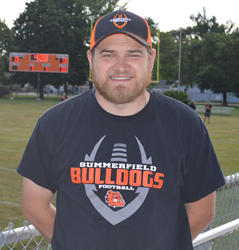 PHOTOS (Top) Petersburg Summerfield’s Mitchell Gomulinski (23) prepares to take on a defender from Erie Mason this season. (Middle) Bulldogs quarterback Trace Secor considers his options from the pocket. (Below) Summerfield coach Dylan Szegedi. (Action photos by Kendra Dafoe; Szegedi photo by Doug Donnelly.)