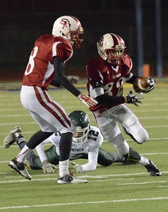 PHOTOS (Top) Pontiac Notre Dame Prep quarterback Sam Stowe (15) throws a pass during the Division 5 Final while protected by lineman Adrian Fernandez (56). (Middle) Fighting Irish coach Pat Fox leads his team – including Henry Ewles (72) and Brody Sink (7) – off the field.