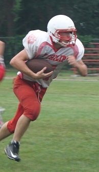 PHOTOS: (Top) Battle Creek St. Philip’s Drew Lantinga hauls in a pass last season; he’s moving to quarterback this fall. (Middle top) Dave Downey, Noah Ellinger, Grayson Obey. (Middle below) Senior Tim Minier surges after taking a hand-off during practice earlier this month. (Below) Ben Swagler pushes ahead during the Tigers’ 2015 win over Portland St. Patrick. (Photos from 2015 courtesy of Battle Creek St. Philip; practice photo and head shots by Pam Shebest.)