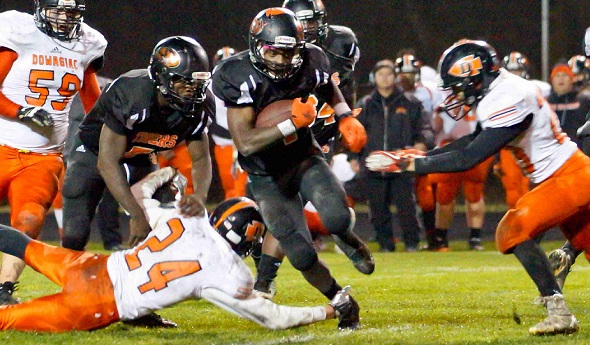 PHOTO: A Benton Harbor ball-carrier charges past two defenders during last week’s playoff win over Dowagiac. (Photos courtesy of Randy Willis/Harbor Photography.)