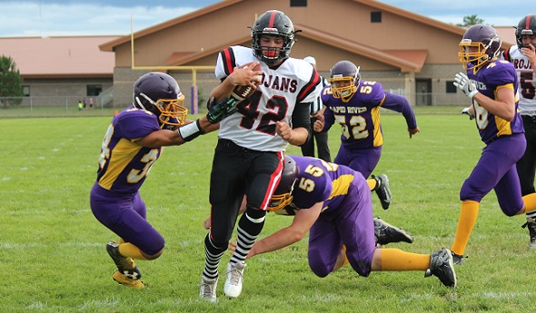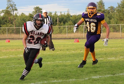 PHOTOS: (Top) Dan Nocerini of Crystal Falls Forest Park barges through a huge hole for a four-yard touchdown against Rapid River defenders David Johnson, left, and Gavin Harris (55) in their season opener. (Middle) Parker Sundell finds some running room after getting around Rockets defender Levi Miller. (Below) Roy Hagglund of Crystal Falls Forest Park reaches for a pass as Austin Wicklund of Rapid River defends. (Photos by Dennis Grall.)