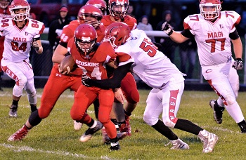 PHOTOS: (Top) Philip Alva gets around the corner during last week’s win over Camden-Frontier. (Middle) Brenden Shelton locks up a Camden-Frontier ball carrier. (Photos by Laura Alva/JoeInsider.com.)