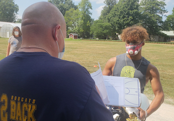 PHOTOS: (Top) Ottawa Lake Whiteford football coach Jason Mensing, right, takes the temperature of Cole Giesige prior to the start of Monday’s first practice of the 2020 season. (Middle) Mensing fills in a questionnaire with Devon Shaw. (Photos by Doug Donnelly.)