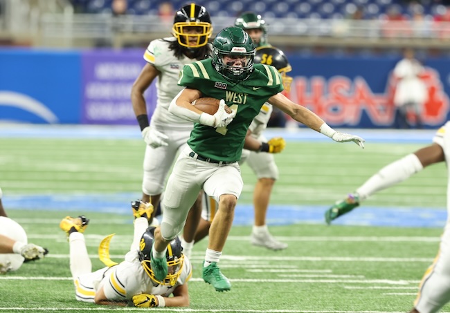 DETROIT – Keaton Hendricks put his name atop the MHSAA Football Finals record book Saturday, scoring six touchdowns to lead Zeeland West to a 42-22 Division 3 victory against Detroit Martin Luther King.