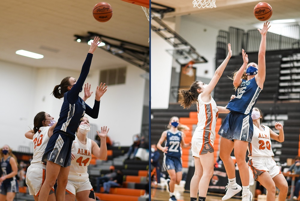 PHOTOS: (Top) Bay City John Glenn’s Abi Tarrant, left, and Carly McCrum make strong moves to the hoop against Alma this season. (Middle) Tarrant focuses for a free throw. (Below) McCrum maintains possession against Freeland. (Photos by Jodi Stopyak.)