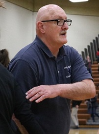 PHOTOS: (Top) Hartland girls basketball coach Don Palmer stands for the national anthem before a game at Howell last month. (Middle) Palmer, also during the game against the Highlanders. (Below) Palmer talks with his team during a timeout. (Photos by Tim Robinson.)