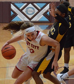 PHOTOS: (Top) Kent City’s Kenzie Bowers drives to the basket against White Cloud during a Dec. 7 win. (Middle) Bowers works to get past a Detroit Martin Luther King defender during their Dec. 8 game at Okemos. (Photos courtesy of the Bowers family.)