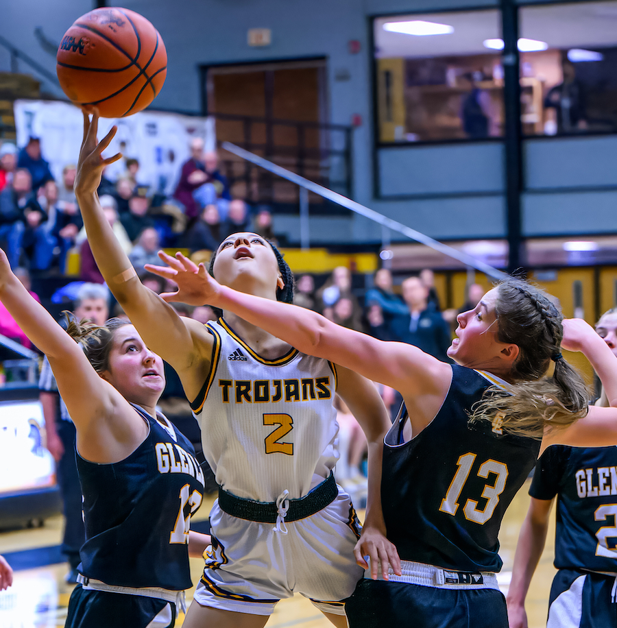 PHOTOS (Top) Otsego’s Hannah Fitzpatrick (23) gets to the lane in her team’s 44-42 overtime win over Plainwell. (Middle) Traverse City Central’s Jakiah Brumfield (2) splits two defenders on her way to scoring in the Trojans' 41-29 win over previously-undefeated Glen Lake last week. (Photos by Gary Shook and Rick Sack, respectively.)