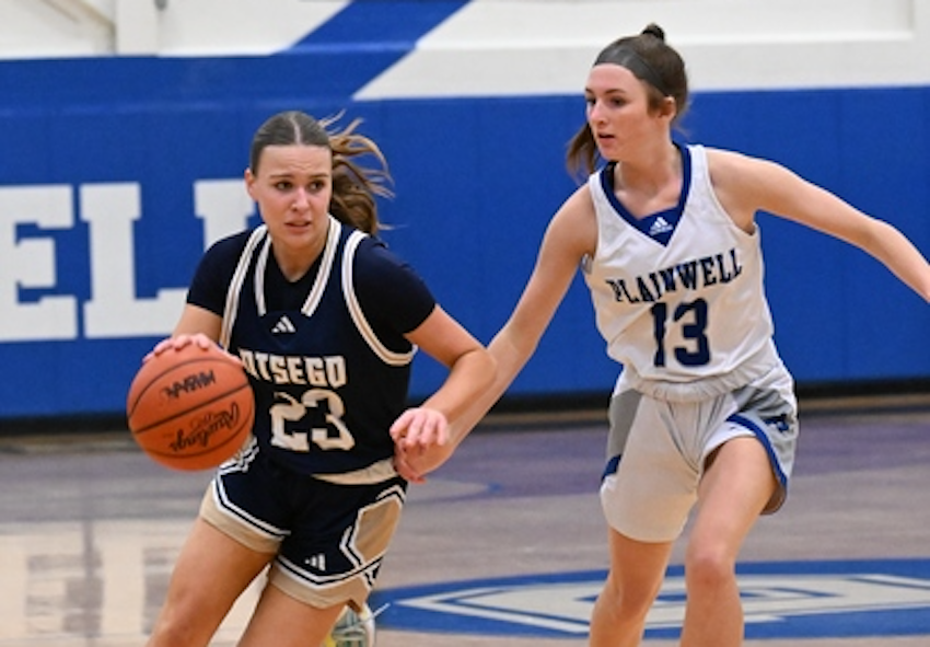 PHOTOS (Top) Goodrich's Kayla Hairston leads her team on a break during a 61-48 win over Lake Fenton on Feb. 16. (Middle) Plainwell's Brooklyn Timpe (13) works to wall off Otsego's Audrey Lingbeek during the Bulldogs' 41-37 win Feb. 16. (Top photo by Terry Lyons; middle photo by Gary Shook.)