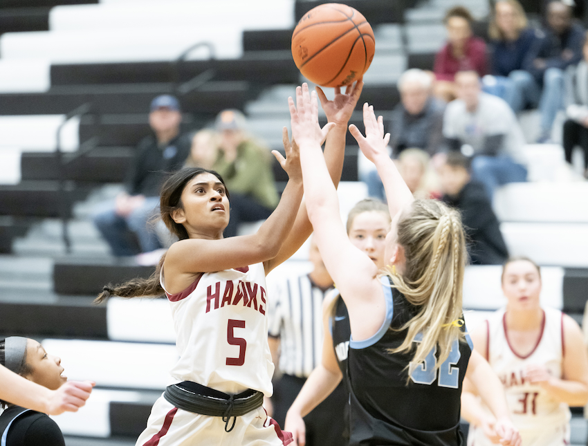 PHOTOS (Top) Bath’s Aubrie Schaibly (30) works to wall off Fowler’s Katie Spicer during the Eagles’ 46-41 overtime win Friday. (Middle) Ada Forest Hills Eastern’s Hannah Bhatnagar (5) puts up a shot against Forest Hills Northern earlier this season. (Top photo by Click by Christine McCallister; middle photo by Michigan Sports Photo.)