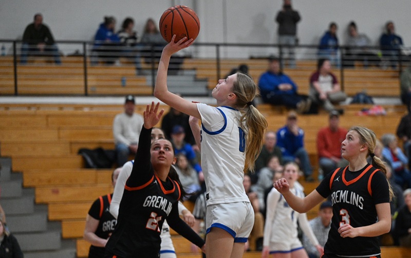 PHOTOS (Top) West Bloomfield defenders close in on Tecumseh’s Lauren Kilbarger (12) during her team’s win over the Lakers in December. (Middle) Houghton's Eva Gerard gets a hand up as Ishpeming Peyton Kakkuri take a shot during the Hematites’ 61-49 win Thursday. (West Bloomfield/Tecumseh photo by Team Arreguin Photos. Houghton/Ishpeming photo by Cara Kamps.