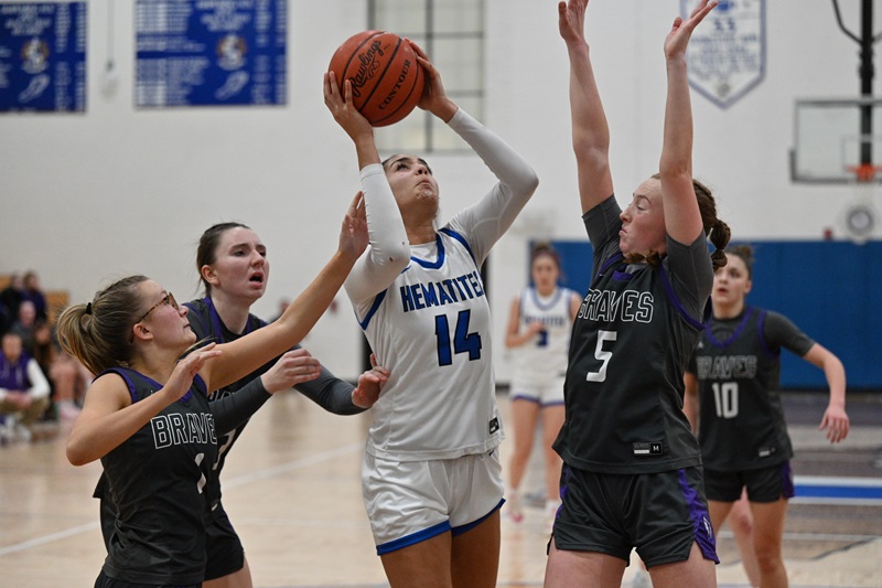 PHOTOS (Top) Lansing Christian’s Sophia Carrillo reaches to collect a loose ball during her team’s 43-37 double overtime over Bath on Feb. 5. (Middle) Ishpeming's Mya Hemmer attempts to put up a shot while surrounded by Gladstone defenders during Gladstone’s 53-46 win on Feb. 4. (Lansing Christian/Bath photo by Click by Christine McCallister. Ishpeming/Gladstone photo by Cara Kamps.)