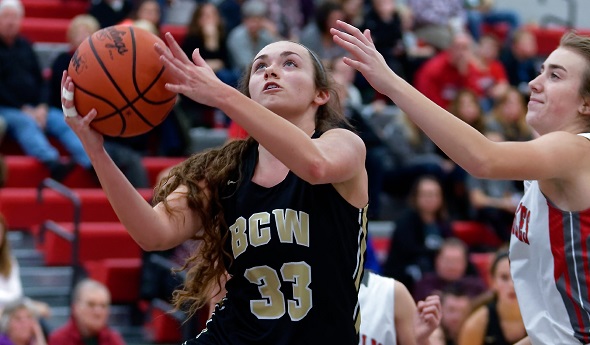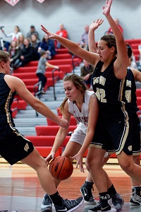 PHOTOS: (Top) Bay City Western’s McKenna Walker gets to the basket during Bay City Western’s opener against Frankenmuth. (Middle) The Warriors defend the post against the Eagles. (Photos by Chip DeGrace.)