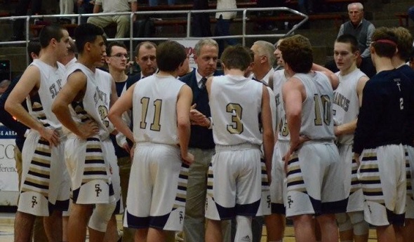 PHOTOS: (Top) Traverse City St. Francis coach Keith Haske huddles with his boys basketball team during a game against Grayling. (Middle) St. Francis' girls team, here against Kalkaska, will play for a District title Friday. (Below) Haske speaks with a few of his players during a District game against Grand Traverse Academy. (Photos by Julie English.)