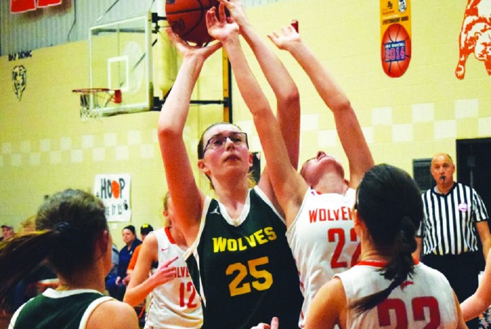 PHOTO: Carney-Nadeau's Tessa Wagner, here last season against Rock Mid Peninsula, is averaging 22 points and 17 rebounds per game. (Photo courtesy of the Escanaba Daily Press.)