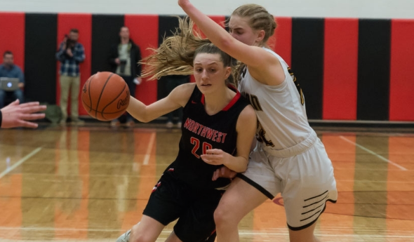 PHOTO: Jackson Northwest's Sydney Shafer drives hard to the basket during Tuesday's Quarterfinal win over Hamilton. (Photo courtesy of JTV.)