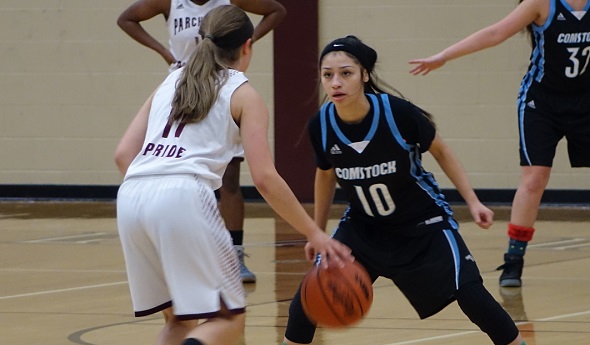PHOTOS: (Top) Comstock sophomore Caylin Lopez guards a Parchment ball handler this season. (Middle top) Comstock coach Justin Ansel and sophomore Daisy Ansel. (Middle below) Comstock junior Ahkyla Blakely and senior Arreona Blakely. (Below) Sophomore Madelyn Caswell (40) works to defend a shot. (Action photos courtesy of the Comstock girls basketball program; head shots by Pam Shebest.)