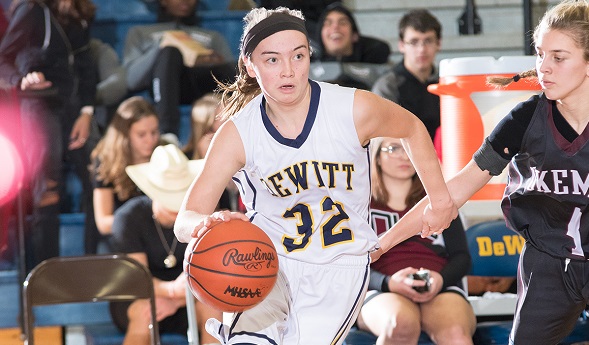 PHOTO: DeWitt's Madison Petersen works to get around an Okemos defender during a victory earlier this season. (Photo by TCP Photography.)