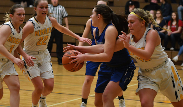 PHOTO: Negaunee's Abigail Nelson (42) tries to grab the ball away from Ishpeming's Jocelynn Nyman (10) as teammates MacKenzie Karki (3) and Chloe Norman (22) provide support. (Photo by Cara Kamps.)