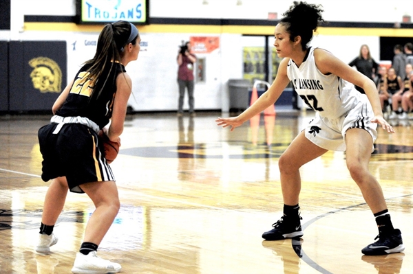 PHOTO: East Lansing’s Aaliyah Nye (32) guards a Grand Ledge ball handler during a District win two weeks ago. (Photo by Terry Lyons.)