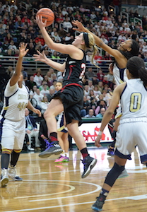 PHOTOS: (Top) Country Day’s Destiny Pitts works to get past Marshall’s Georgianna Pratley during Friday’s Class B Semifinal. (Middle) Redhawks senior Nikki Tucker drives to the basket.