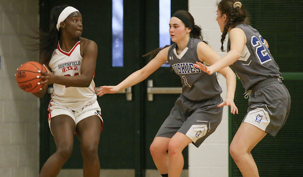 PHOTO: Southfield’s Alexis Johnson is defended by a pair of St. Clair Shores Lakeview players during Tuesday’s Quarterfinal. (Photo courtesy of C&G Newspapers.)