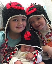 PHOTOS: (Top) Chris and Mary Laney hold their newborn, Owen. (Middle) The Laney children, Ellen, Niall and Owen, smile while wearing their Divine Child hats. (Photos courtesy of the Laney family.)