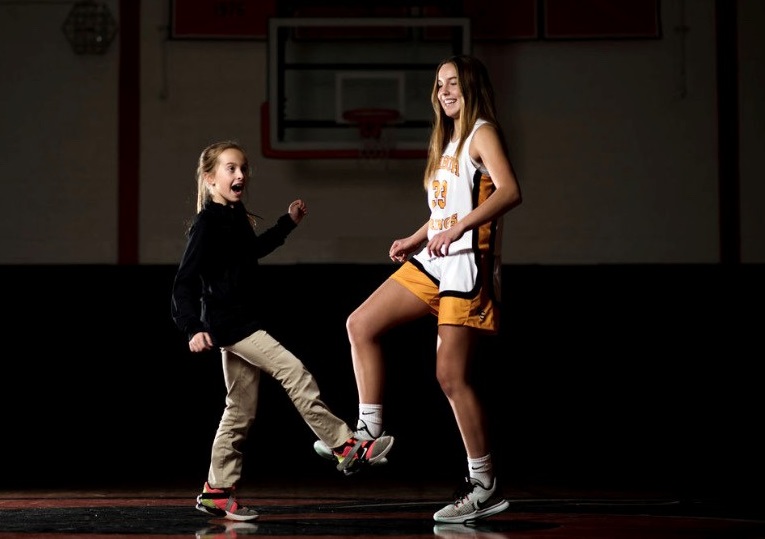 PHOTOS (Top) Harbor Springs’ Olivia Flynn (33) has a spring in her step as she comes off the floor during last Friday’s win over Grayling. (Middle) The Flynn family, from left: Alaina, Amy, Olivia, Braeden, John and Johnny. (Below) Olivia and Alaina share a fun moment. (Photos by Sarah Sheperd.)