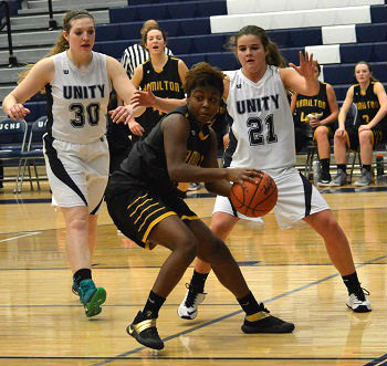 PHOTOS: (Top) Hamilton's Bria Schrotenboer maintains possession against Byron Center this season. (Middle) Senior Franesha Robinson handles the ball in the post against Hudsonville Unity Christian. (Photos courtesy of Covering Hawkeye Sports.)
