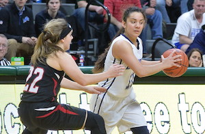 PHOTOS: (Top) Marshall players surround Nikki Tucker after her free throws sent the Redhawks to the Class B Final. (Middle) John Glenn guard Kalle Martinez (11) looks to get past Marshall’s Jill Konkle.