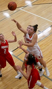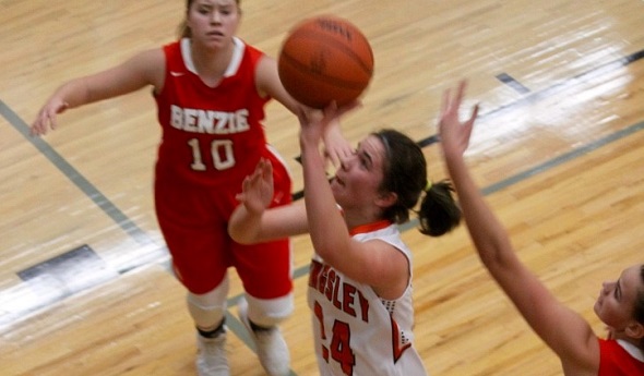 PHOTOS: (Top) Kingsley’s Marie Pierson drives to the basket against Benzie Central last month. (Middle) Jalynn Brumfield cuts through defenders in the Stags’ 67-30 win over the Huskies, who are 12-2. (Photos by Ron Stremlow.)