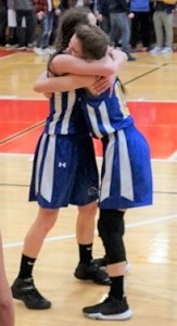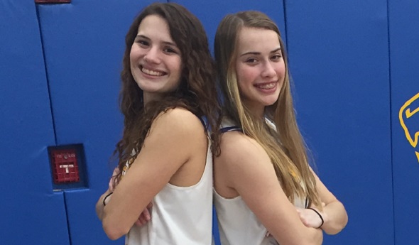 PHOTOS: (Top) Twins Emmaly (left) and Sarah Miller make up a talented backcourt for Birch Run. (Middle) The sisters share a quick hug during a game this season. (Photos courtesy of the Birch Run girls basketball program.)