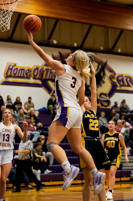 PHOTOS (Top) Caro’s Adelyn Moore brings the ball up court last season against Unionville-Sebewaing. (Middle) Moore (3) drives to the basket Friday against Otisville-LakeVille. (Photos by Kaitlin’s Klicks.)