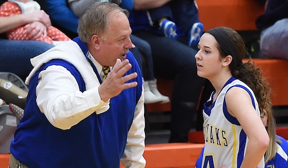 PHOTO: Ida girls basketball coach Tim Leonard instructs one of his players. (Photo by Tom Hawley.)