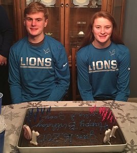PHOTOS: (Top) The Ayrault family, from left: Annabel, Adam, Andy, Kim, Julia and Joe; inset: Julia and Joe suiting up for Grosse Pointe North. (Middle) Julia and Joe celebrate a birthday together in 2012. (Below) Julia and her dad/assistant coach Andy anchor the right side of the team photo after last season’s District title win. (Photos courtesy of the Ayrault family.)