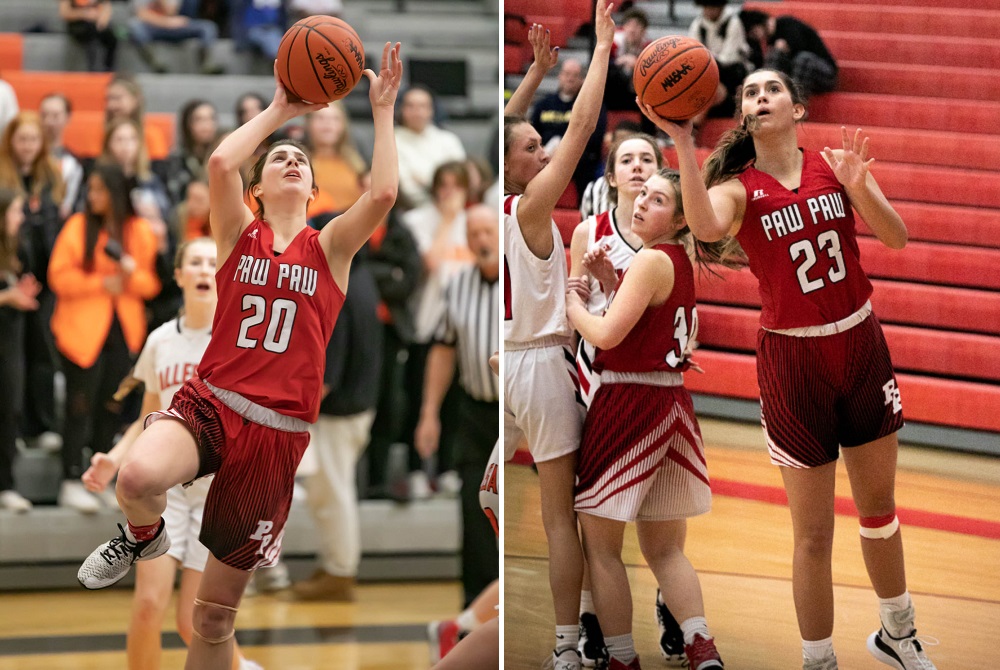 PHOTOS (Top) Paw Paw sophomores Addison Roy, left, and Katelyn Baney are leading a resurgent varsity this winter. (2) From top: Baney, Roy and coach Ernie Ramirez. (3) Roy gets in position for a rebound against Vicksburg. (4) Baney follows through on a free throw. (Action photos by Brent McNitt/1001 Words Photography. Head shots by Pam Shebest.)
