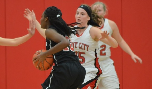 PHOTO: Kaitlyn Geers defends at the top of the key during last week's win against Grand Rapids Union. (Photo courtesy of Kent City athletic department.)
