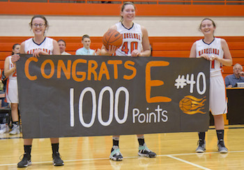 PHOTOS: (Top) Eileene Naniseni, dribbling, works to get past a defender. (Middle) Naniseni, middle, holds up with teammates a banner celebrating her 1,000th point after reaching the milestone Jan. 11 against Fife Lake Forest Area. (Photos by Joanie Moore/JoanieMoore.com.)