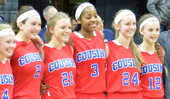 PHOTOS: (Top) Kierra Fletcher (3) poses for a photo with her teammates after Warren Cousino won last season’s Class A championship. (Middle) Fletcher brings the ball up the court during her team’s Semifinal win over Hudsonville.