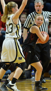 PHOTOS: (Top) St. Ignace’s Emily Coveyou makes a move toward the basket during Thursday’s Division 4 Semifinal. (Middle) Kingston’s Gerilyn Carpenter looks for a teammate while Ally Schultz defends.