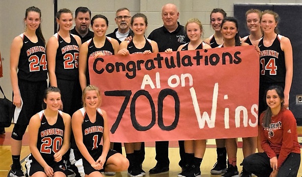 PHOTO: Sandusky girls basketball coach Al DeMott stands with his team as they celebrate his 700th career win last month. (Photo courtesy of the Sandusky girls basketball program.)