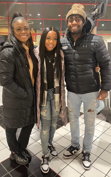 PHOTOS (Top) At left, Jordan Walker stands with her class on the Breslin Center floor during the 2017 MHSAA/Farm Bureau Scholar-Athlete Awards ceremony, and at right in 2023 after receiving her second master's degree from University of Tennessee. (Middle) Walker makes her move toward the basket during a game her senior season at Muskegon Mona Shores. (Below) Jordan Walker, middle, takes a photo with sister Jasmyn and brother Jarvis. (Graduation and family photos courtesy of the Walker family; Mona Shores basketball photo by Tim Reilly.)