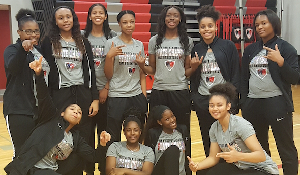 PHOTOS: (Top) This season’s Detroit Edison team, off to an 18-1 start as it pursues a second straight Class C title. (Middle) Gabrielle Elliott readies for a pass during a scrimmage. (Photos courtesy of the Detroit Edison girls basketball program.)