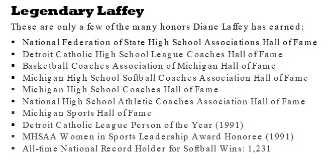 Laffey also gives kudos to the tremendous athletes she's had the opportunity to coach such as pitcher Nikki Nemitz, who later played at Michigan, and basketball players Sarah Judd (Oakland University) and Paula Sanders, the latter a Miss Basketball finalist and later a star player at Michigan State.