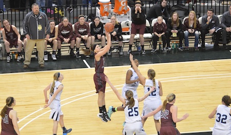 PHOTOS: (Top) Eaton Rapids' Meghan Dassance works to get past South Christian's Renee Broekhuizen in the Class B Final. (Middle) Greyhounds guard Kathryn Mills launches a shot in front of her team's bench Saturday.