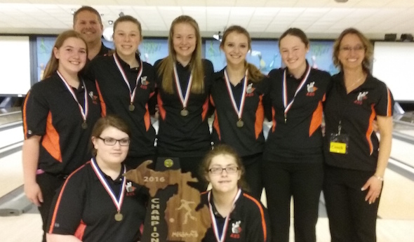 Alma, a Regional champion, had to overcome a poor start in its first Baker game (five players from each team bowl two frames apiece in a single game) to edge Hudsonville Unity Christian by 20 pins, 1,282-1,262. Unity Christian won the first Baker game 222-145, and Alma cut the deficit to 43 pins entering the final match – a Peterson match that features a full game by each of the five players.