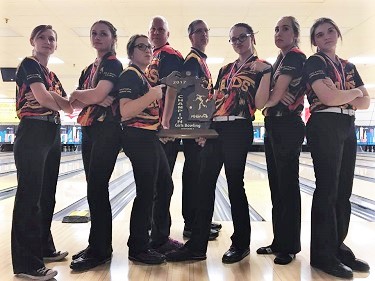 PHOTOS: (Top) The Flint Kearsley girls bowling team hoists its Division 2 championship trophy last season. (Middle) Birch Run’s girls celebrated their first MHSAA Finals title last winter. (Below) Like Kearsley, Davison has built a string of successful finishes in Division 1. (Davison and Kearsley photos courtesy of those schools’ bowling programs; Birch Run’s photo courtesy of Teddy Villarreal.)