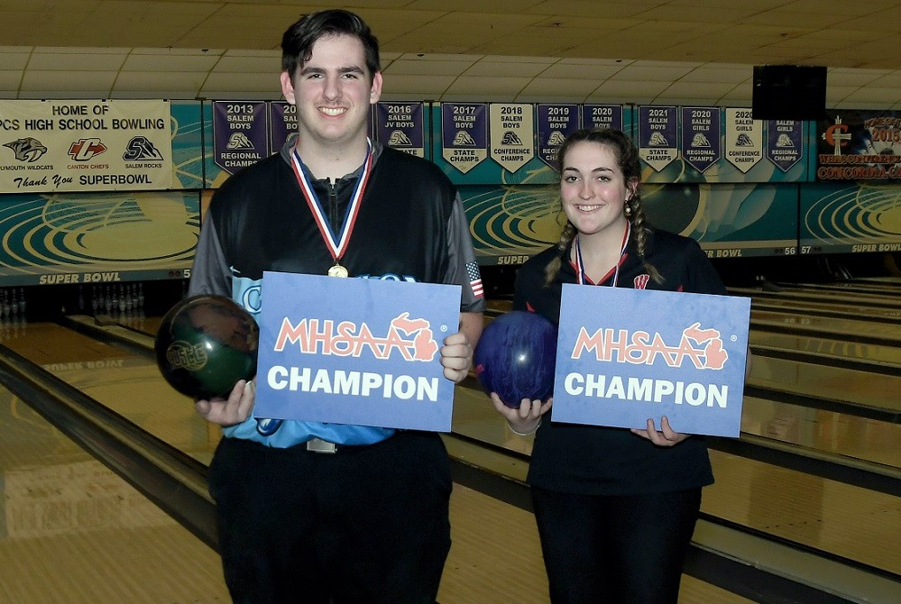 PHOTOS (Top) Gibraltar Carlson’s Zack Sisk and Whitehall’s Karli VanDuinen earned Division 2 singles championships Saturday at Canton’s Super Bowl. (Middle) Sisk celebrates his roll-off victory. (Click for more from Champions Photography.)