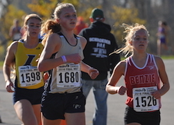 PHOTOS: (Top) Hart’s Adelyn Ackley (right) charges toward the finish in Division 3 just ahead of Lansing Catholic’s Olivia Theis. (Middle) St. Francis’ Joyana Tarsa (1680) leads a pack including Benzie Central’s Lucy Karpukhno (1526). (Click to see more from RunMichigan.com.)